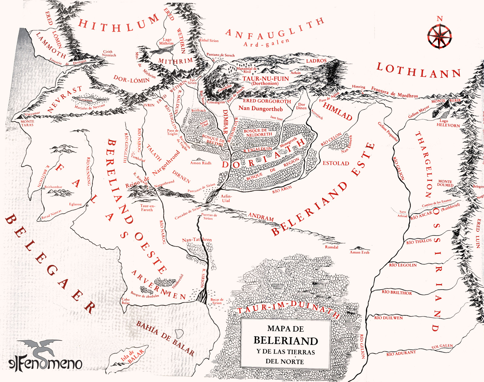 Adjuntamos tambien un mapa de Beleriand proveniente de la pagina Elfenomeno , para que sepais en todo momento de que lugares se está hablando (pincha en él para agrandar).