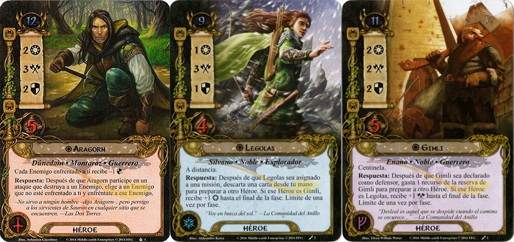 Los héroes Aragorn (táctica), Legolas (espíritu) y Gimli (liderazgo)